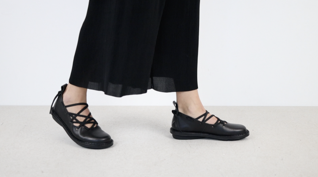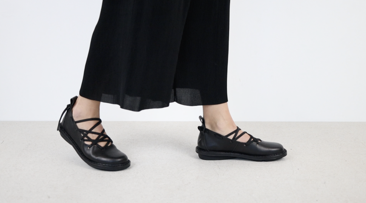 Slip-on ballerina with wide elastic laces criss-crossing over the instep.