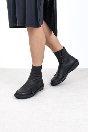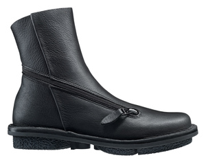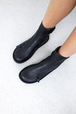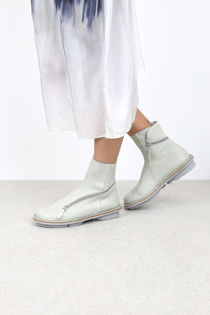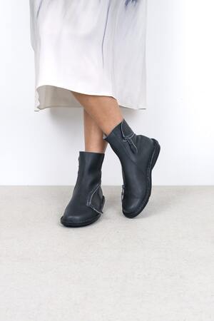 Soft ankle boot with a zipper that playfully starts at the ball of the foot and wraps around the heel, allowing it to be opened from both ends depending on the weather.