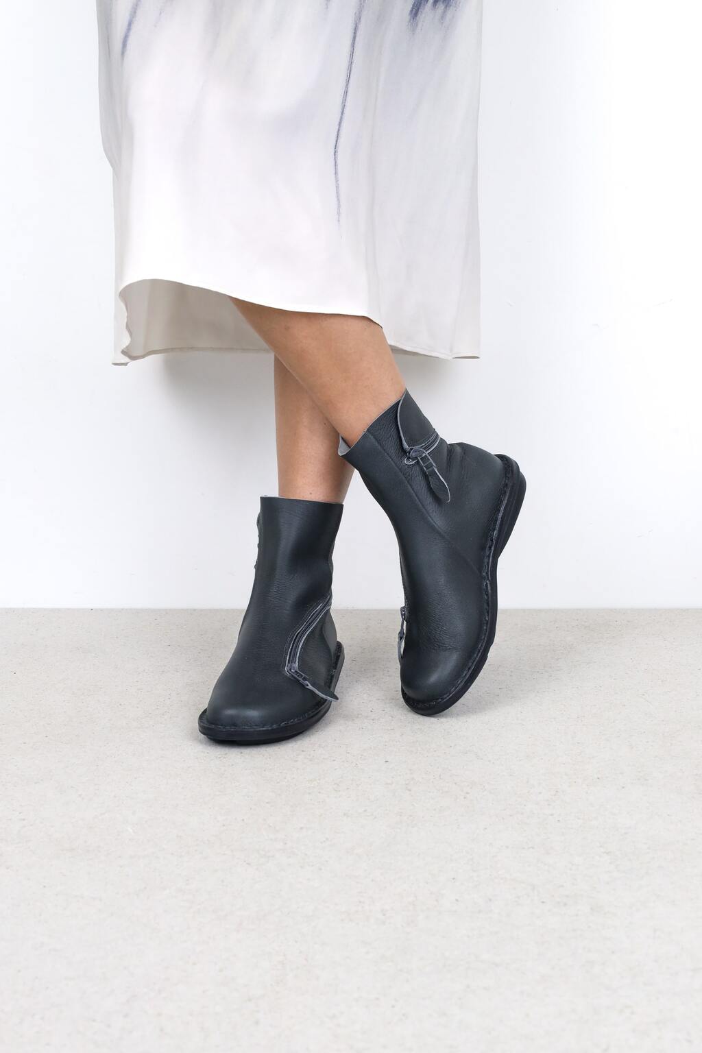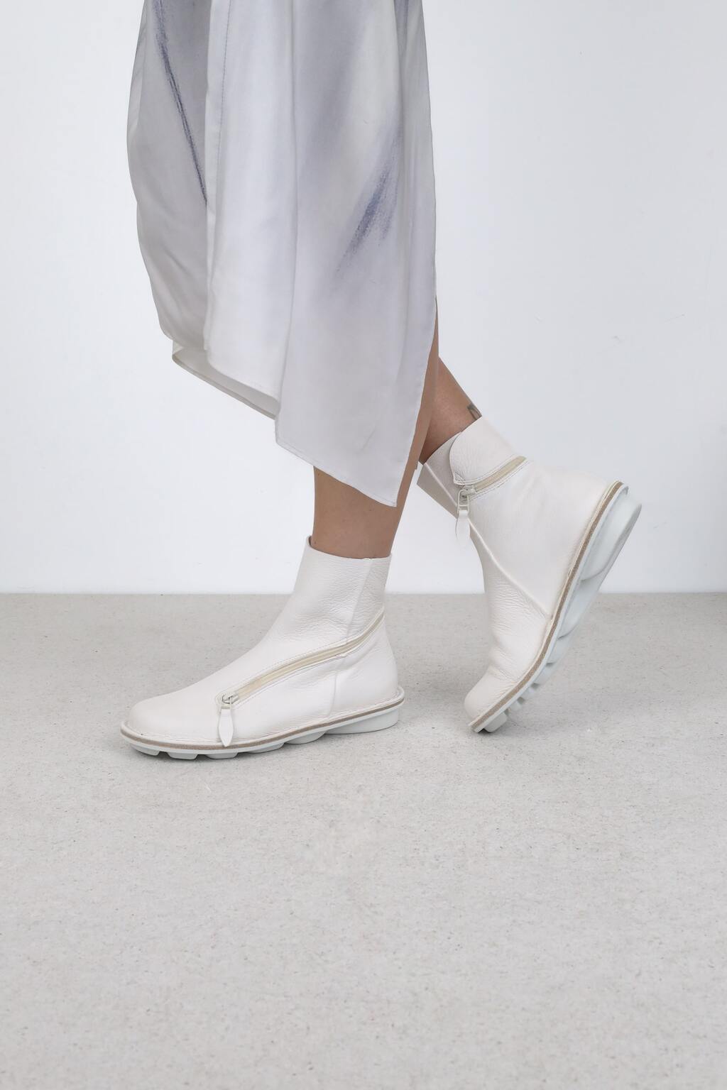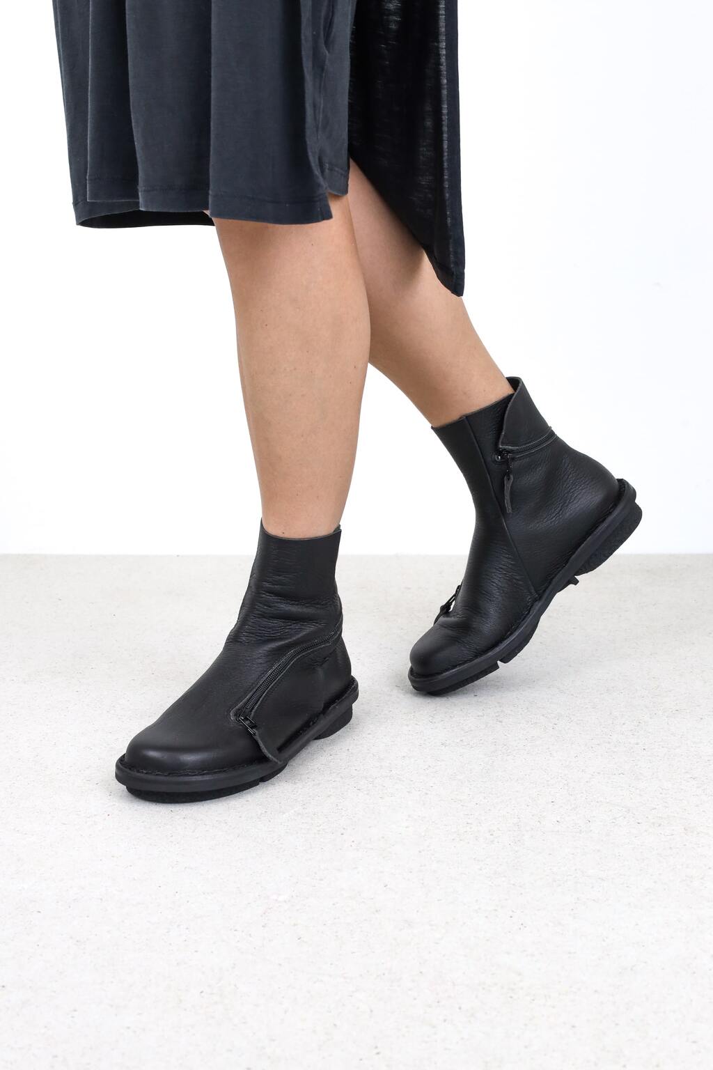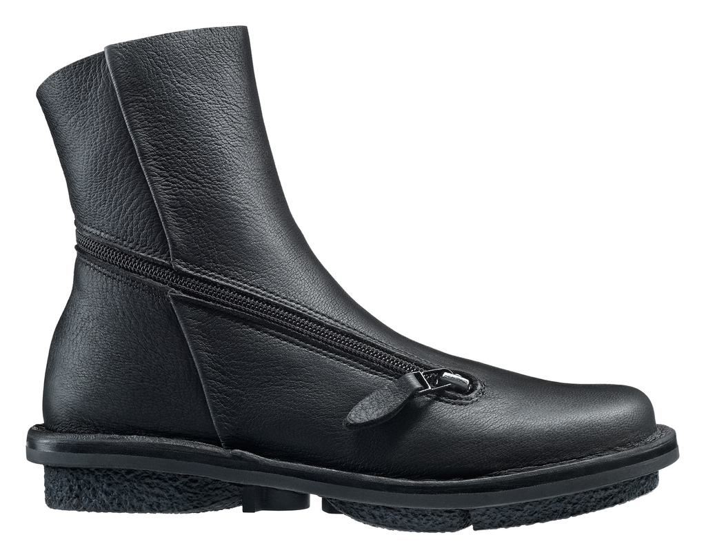 Weiche Stiefelette mit einem Reißverschluss, der spielerisch vom Ballen kommend um die Ferse herum geführt wird und je nach Wetterlage von beiden Enden geöffnet werden kann.