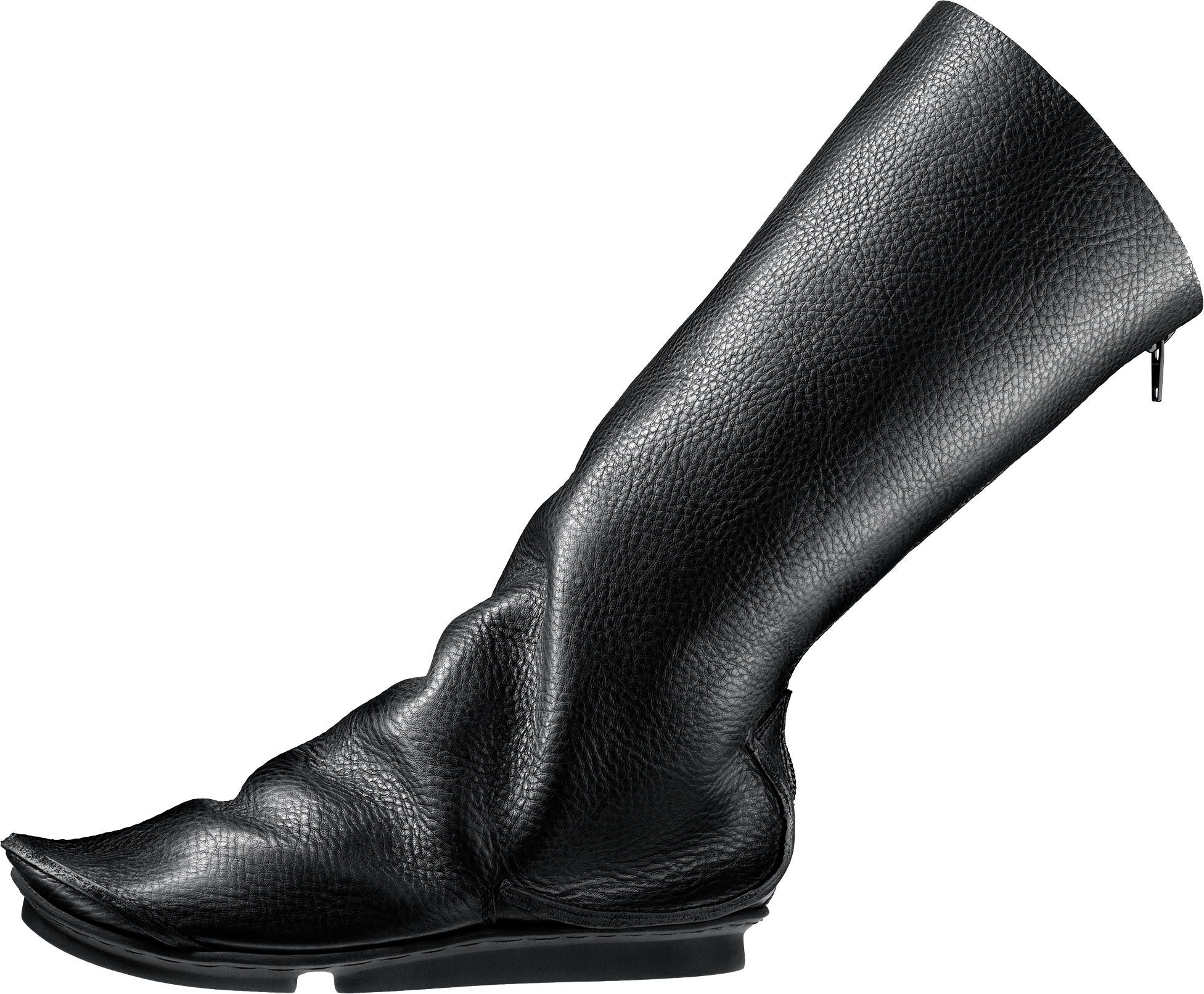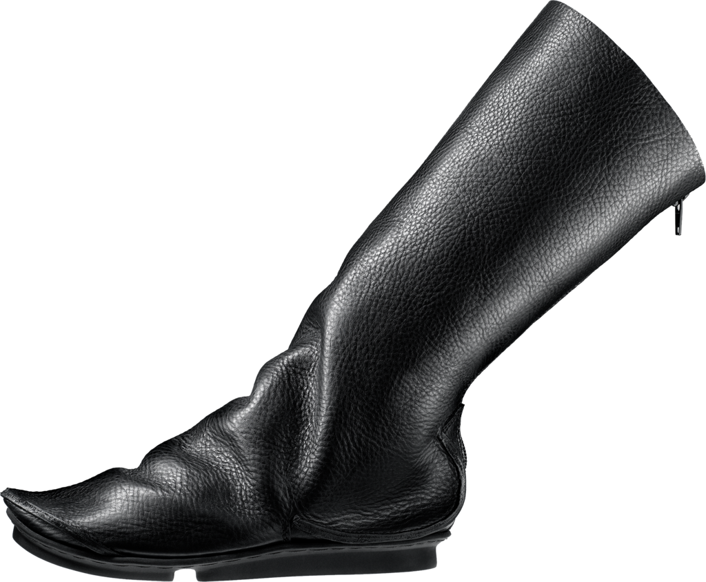 Experimental unisex style that redefines the boundaries of the pattern technique. The upper follows the anatomically given line and falls in soft creases around the ankle.