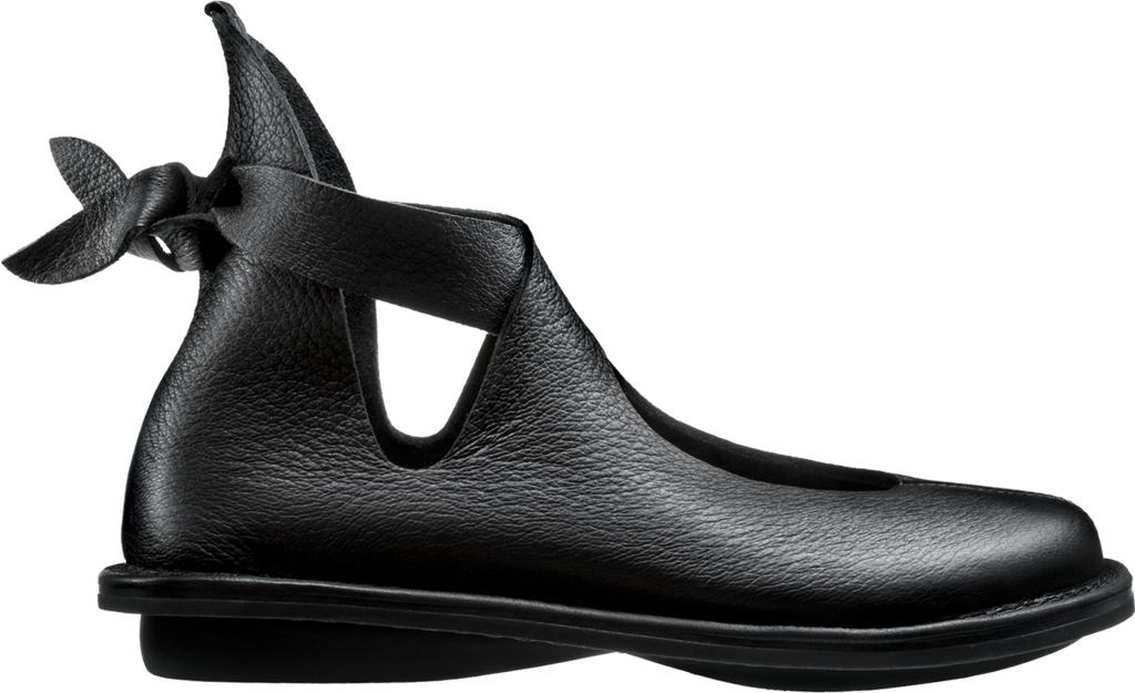 Two straps are crossed on the instep and tied at the heel. The high cut heel part holds this knot in place.