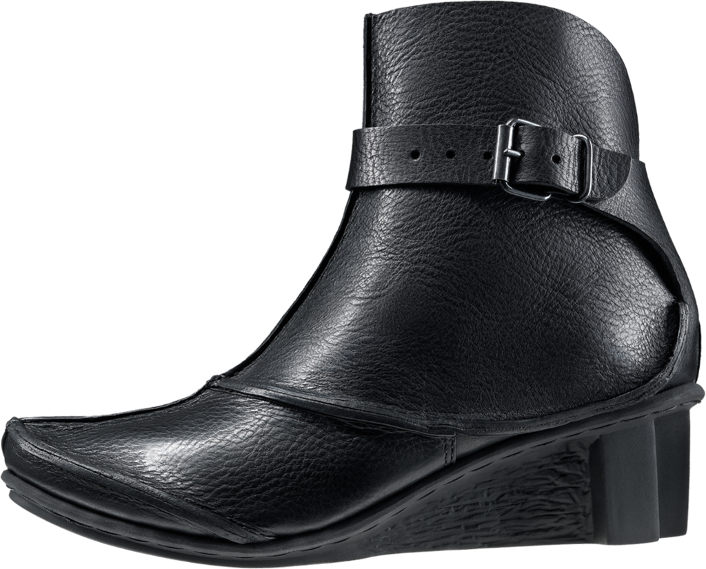 Sleek and simple, slightly tapered, ankle-high boot, with backwards opening.