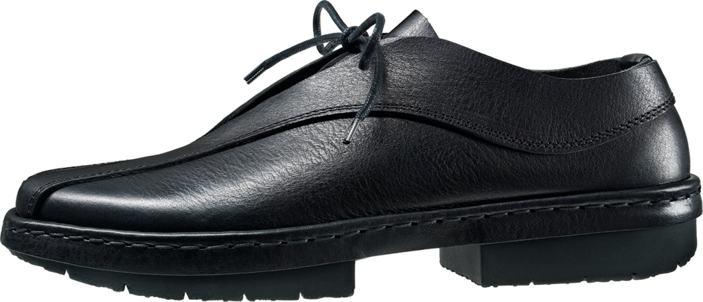 Unisex lace-up shoe with a dynamic curved shape. The covered edging and the partially hidden lacing bestow upon the shoe a particular elegance.