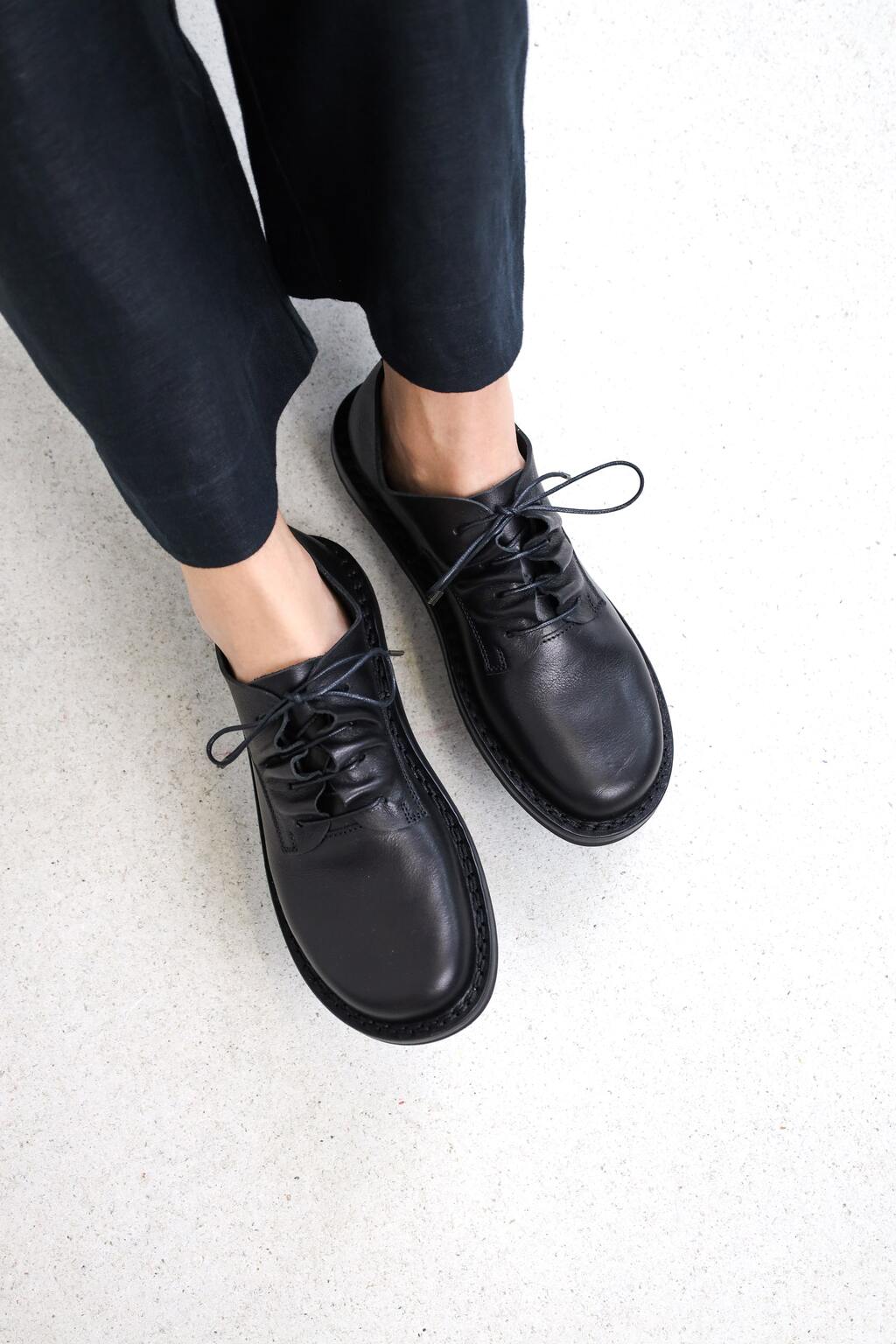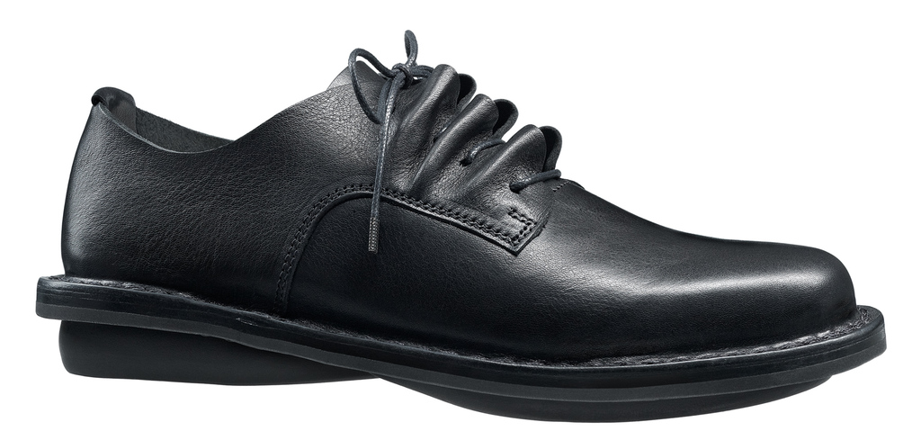 Das Schnürelement dieses klassischen Derby ist in fliessende Wellen gelegt.
