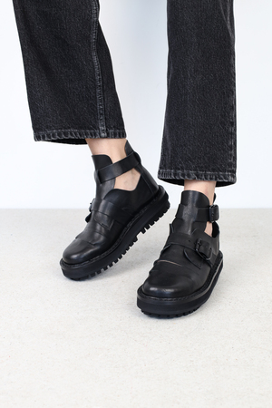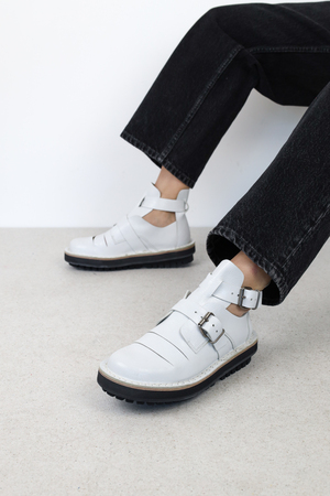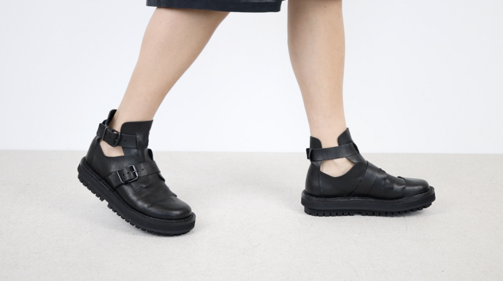 The slits on the vamp and the two buckles used to close the quarters have a touch of the martial about them, which is emphasised by the TR volume platform sole.