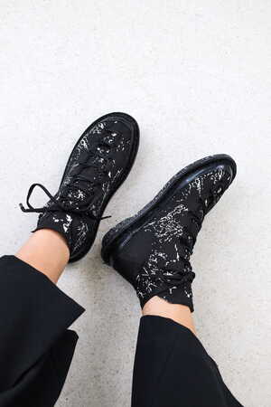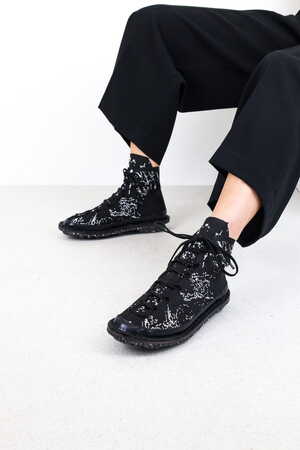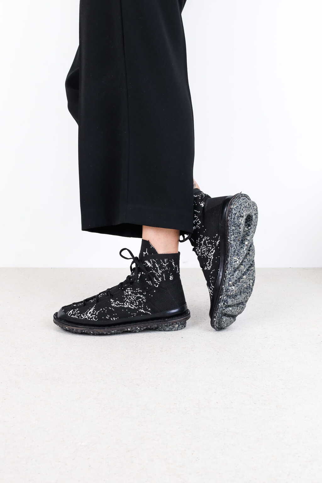 This yarn is made from 90% PET bottles and 10% ocean plastic. Textiles made from this yarn can be recycled by the manufacturer into yarn of equal quality. The shoe features a rubber rand for enhanced durability and is finished with our recycled sole. In addition to the black-and-white “seagull” pattern with a geometric design, we now also offer a new cloudy, dotted pattern on a black background.