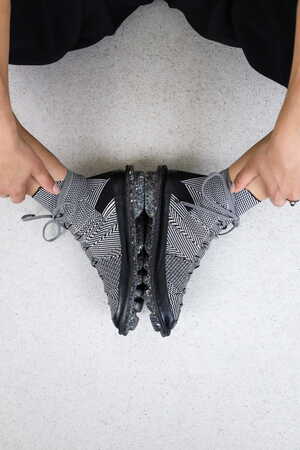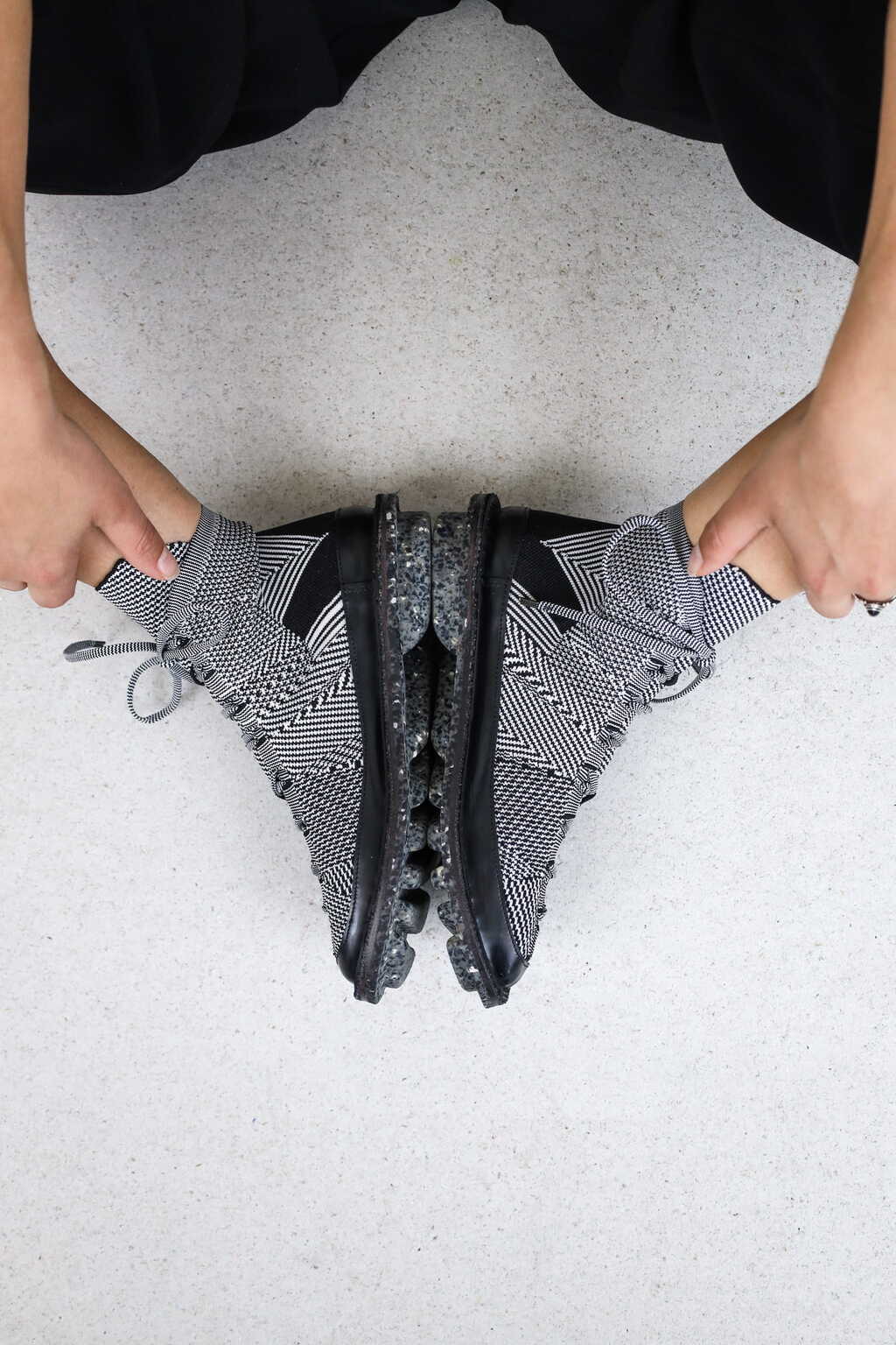 This yarn is made from 90% PET bottles and 10% ocean plastic. Textiles made from this yarn can be recycled by the manufacturer into yarn of equal quality. The shoe features a rubber rand for enhanced durability and is finished with our recycled sole. In addition to the black-and-white “seagull” pattern with a geometric design, we now also offer a new cloudy, dotted pattern on a black background.
