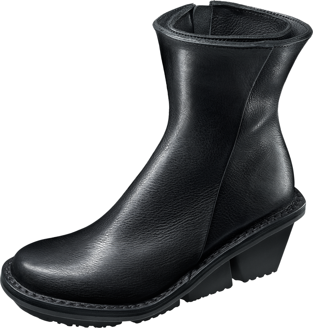 Ankle boot with architectural sculptured brim along the topline and inside zip, whose upper has been blocked at the vamp and the heel section.