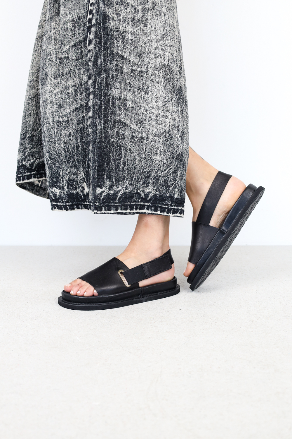 Simple unisex sandal with an elastic heel strap that passes through an eyelet and a Velcro strap closure.