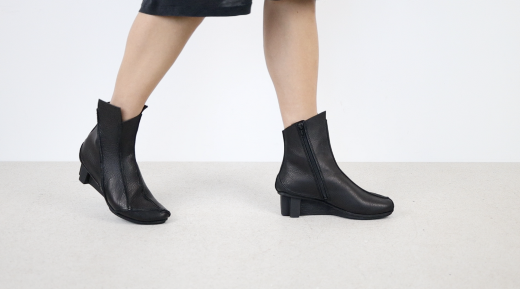 Striking ankle boot with slightly pointy toe shape and inner zip fastener. Complemented by a number of raw seams, the combination of narrow sections lends the model a pleasingly slender shape.