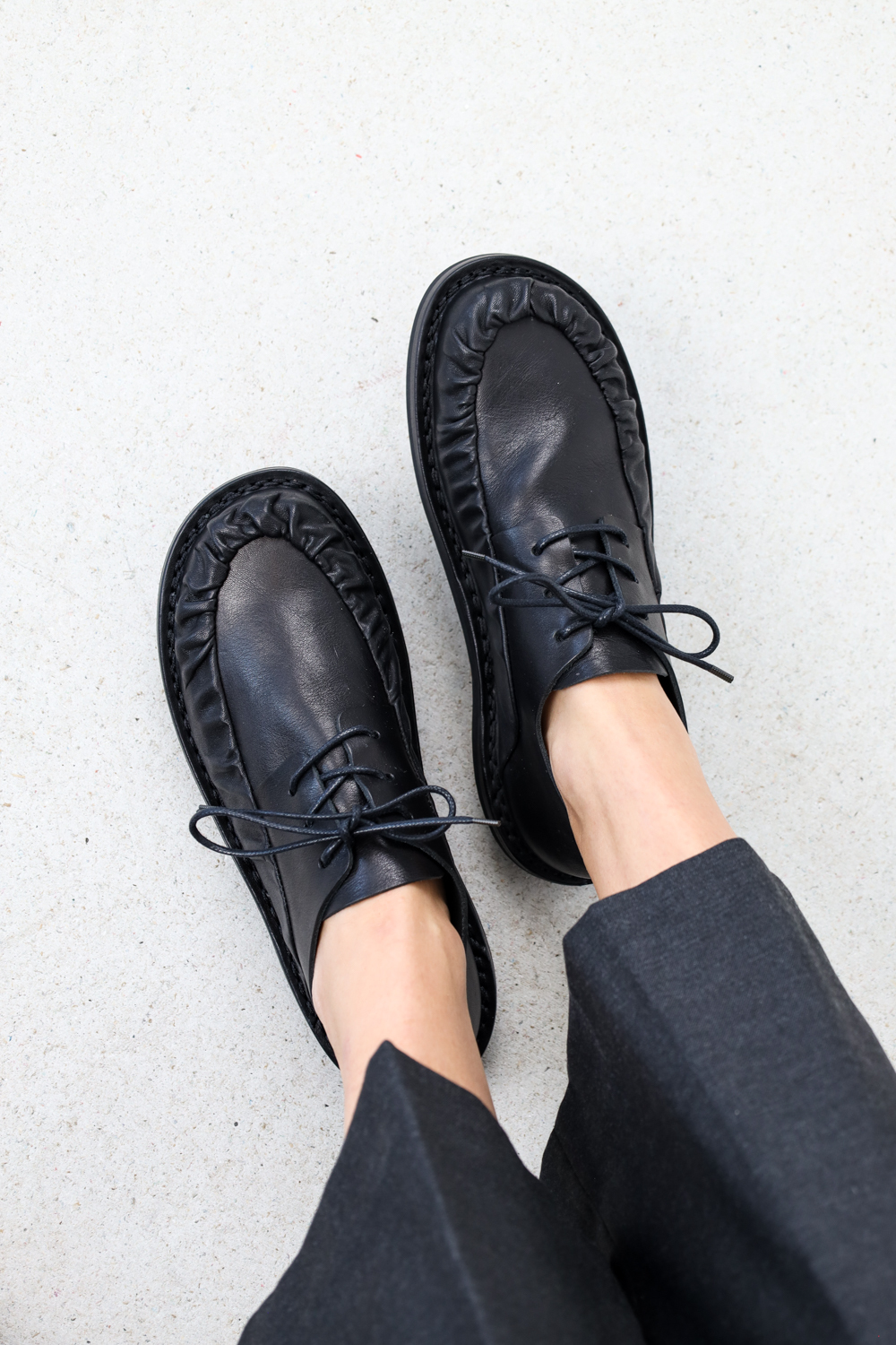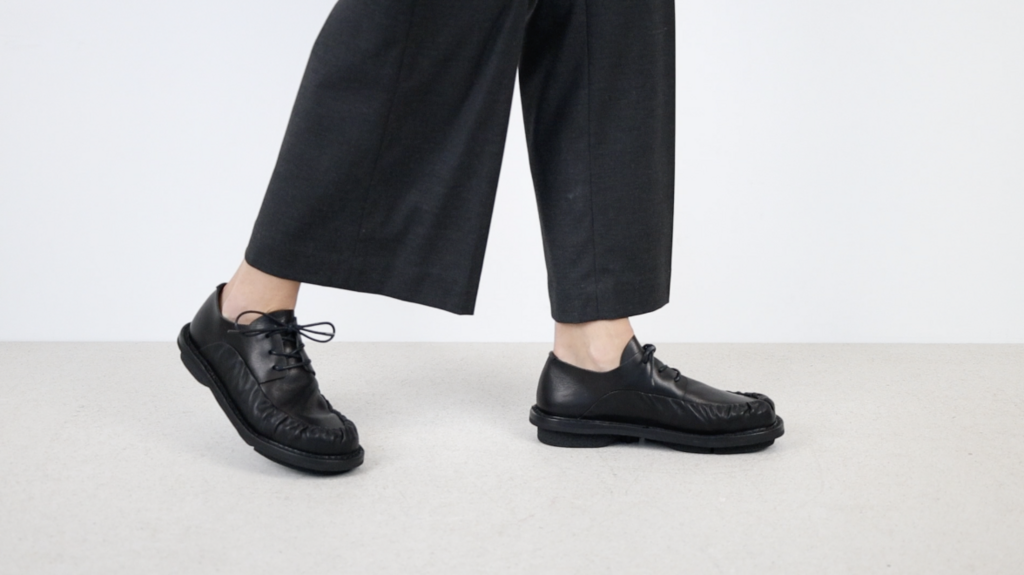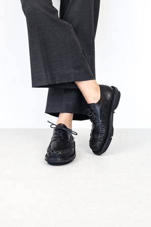Finely formed pleats are bordered on the edge of the vamp and run out under the derby lacing.