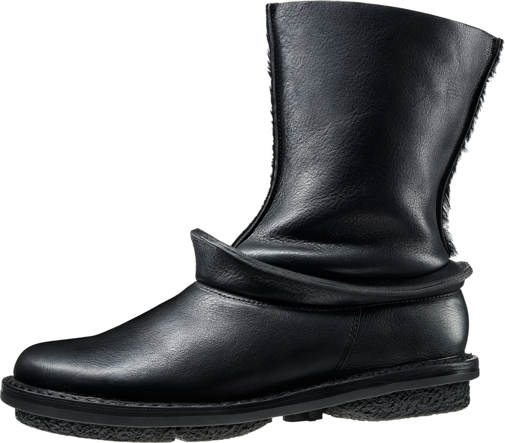 Fully fur-lined ankle boot with inner zip fastener. The sculptural, elliptically shaped brim at the height of the ankle divides the lower section, made from sturdier leather, from the upper, sheepskin section, lending the model a striking silhouette.