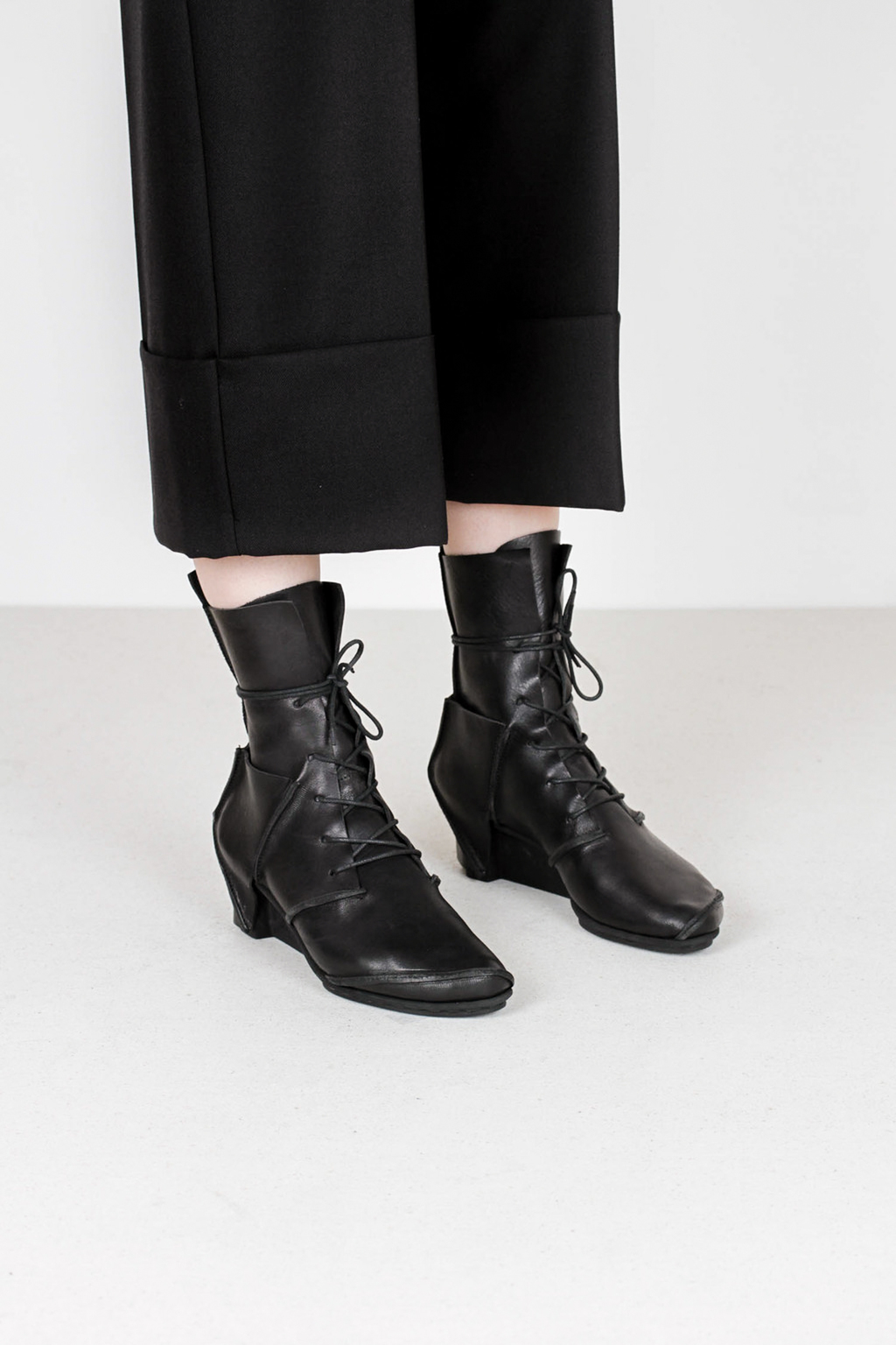 Lace-up ankle boot with geometrically designed heel section completely enclosing the heel.