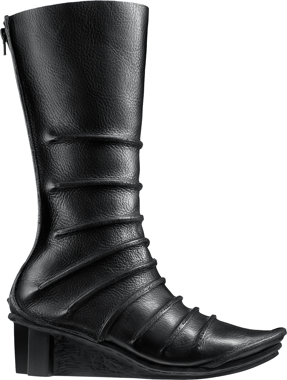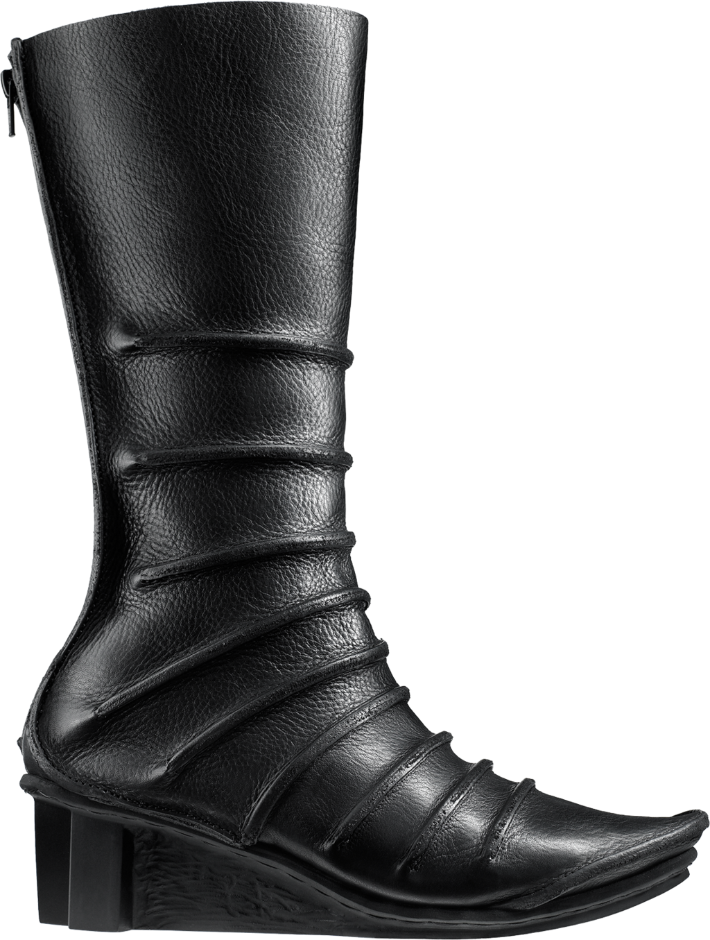 Calf-length boot with nine rhythmical aligned raw seams on the instep.