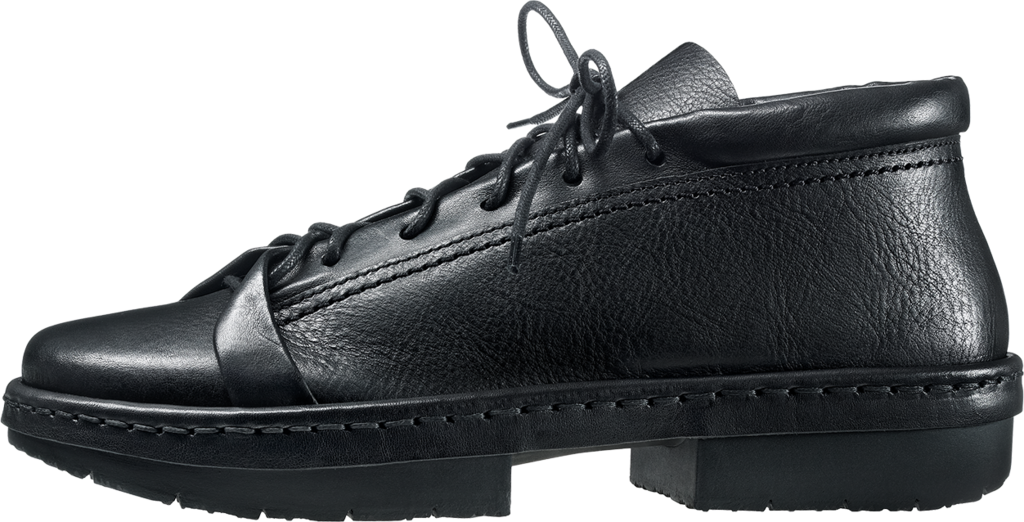 Sporty, simultaneously ultra-modern unisex style inspired by classic working boots. The edge is trimmed with leather and sewn to the sole together with the sole seam. The strip along the edge is padded at the heel and folded decoratively beneath the lacing. A simpler, slightly lower version of last winter’s model »Slam«.
