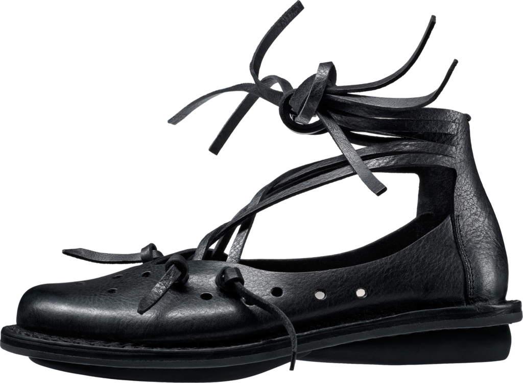 Wilder version of »String«. The straps on both sides can be tied around the ankle, across the foot, threaded through the holes in the vamp and laced into small knots. The knots even allow the straps' individual adjustment.