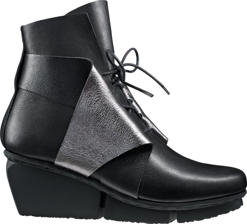 Ankle boot with superimposed, doubled and outward folded side sections, whose different material and colour combinations create attractive contrasts.