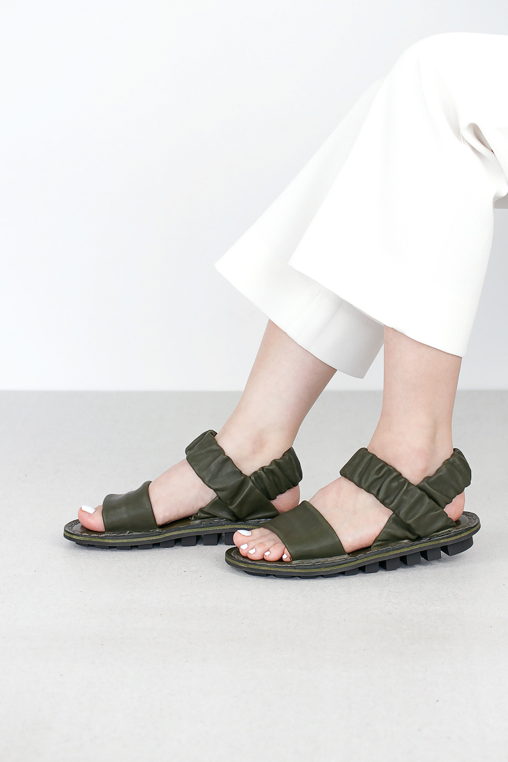 Classic sandal with a smooth leather strap across the front of the foot and leather-covered elasticated straps across the instep and heel.