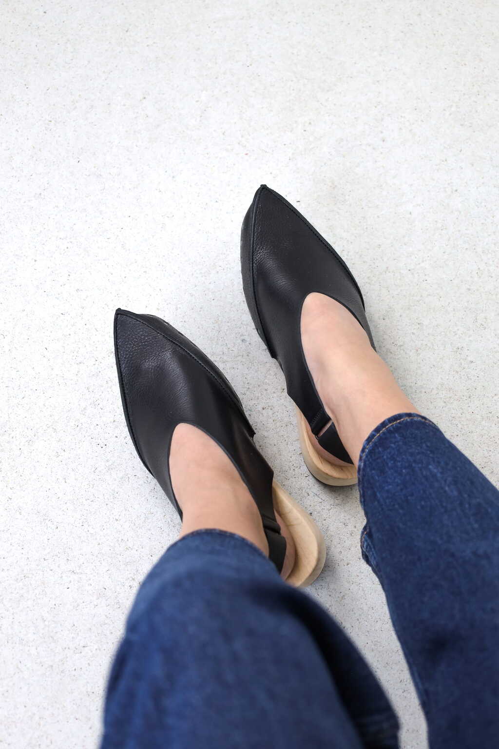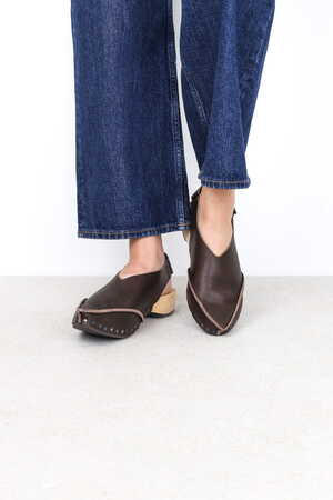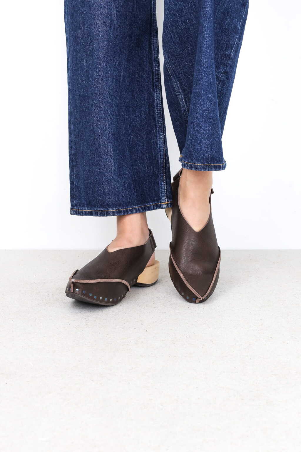 The distinctive toe of this wooden clog is shaped with multiple seams. A hook-and-loop strap around the heel provides support.