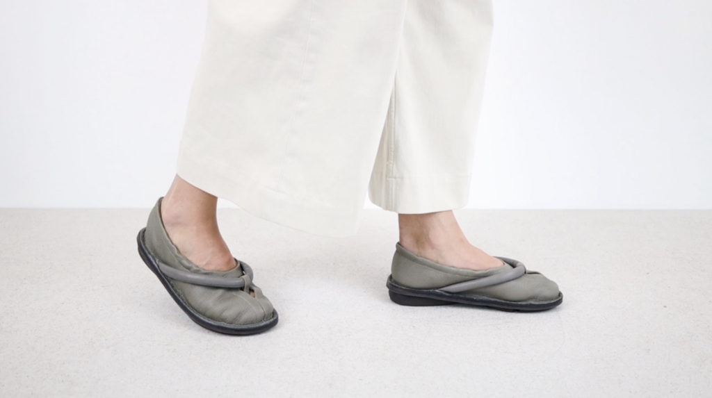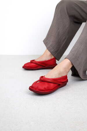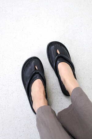 This soft slip-on ballet flat is combined with a padded flip-flop strap, creating a new Tabi-inspired look.