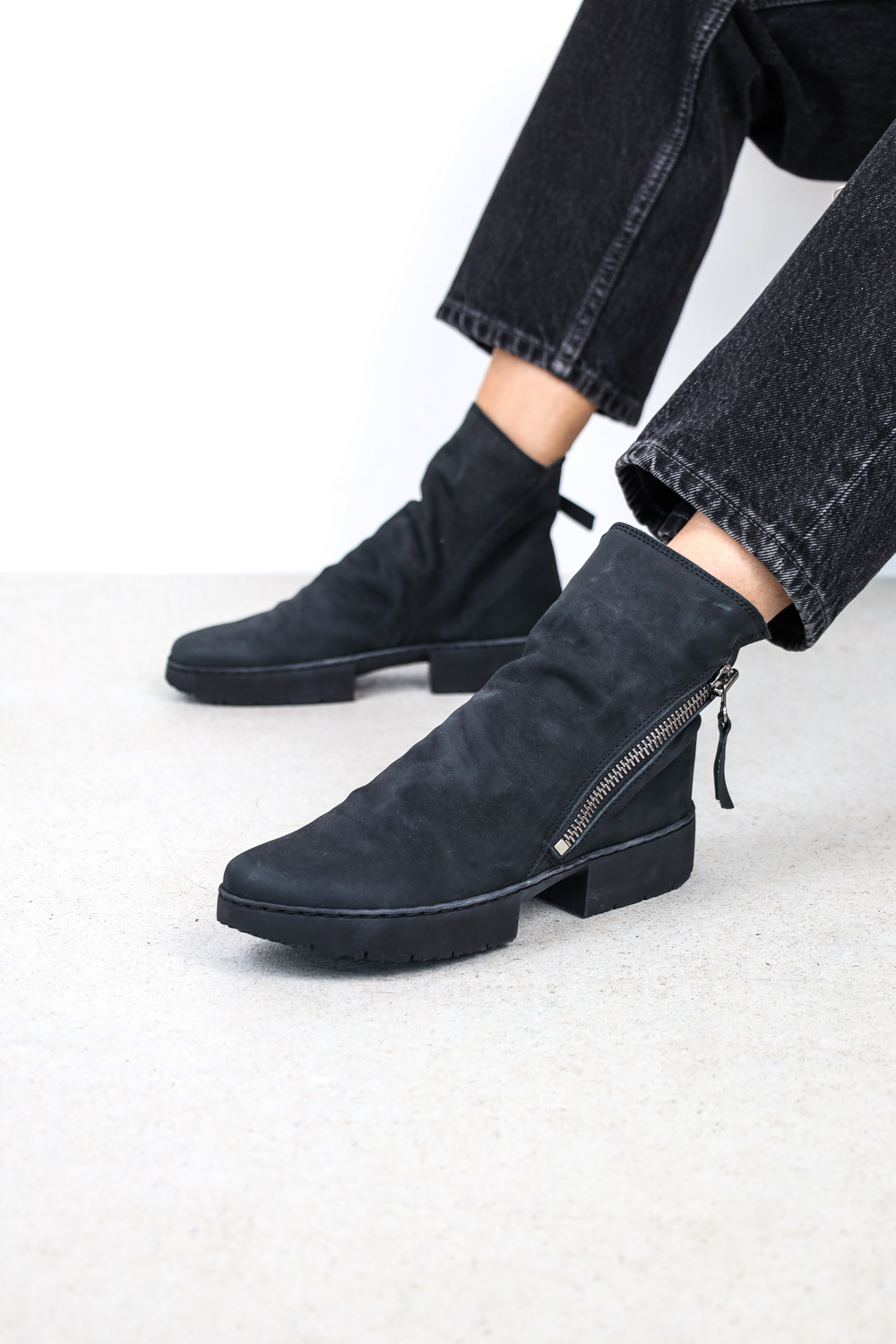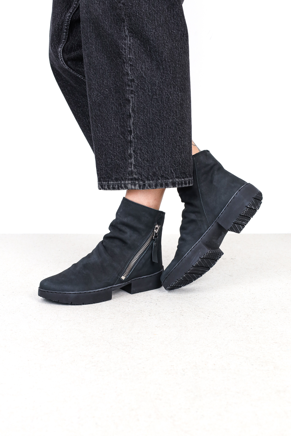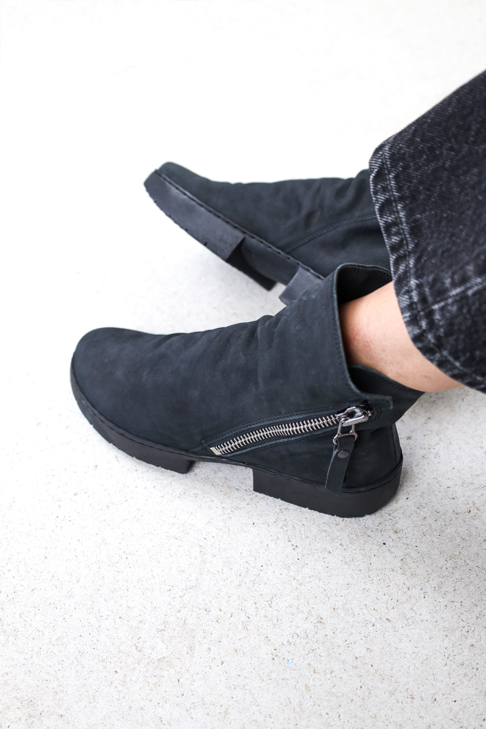 Graphic unisex ankle boot with wide metal zip on the outside and a light drape on the instep.