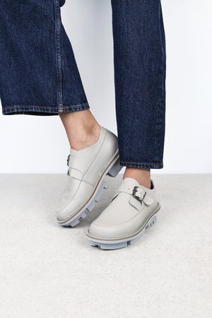 Classic unisex low-cut shoe with elegant surface and a simple buckle over the instep. Available in a range of colour combinations.
