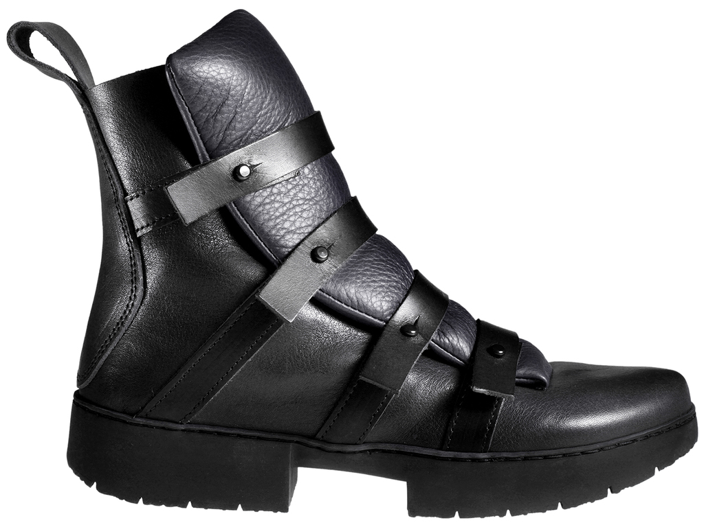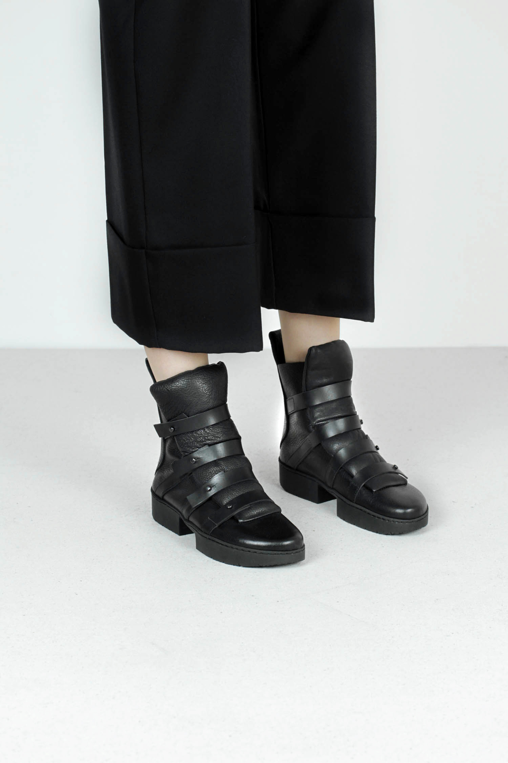 Ankle boot with padded flap and four narrow straps with button fastening. When putting the boot on, opening the two upper straps is sufficient. Available as both a tone-in-tone style and in various colour and material combinations.