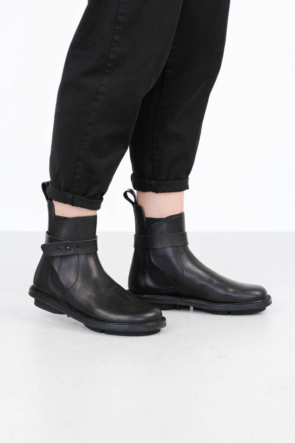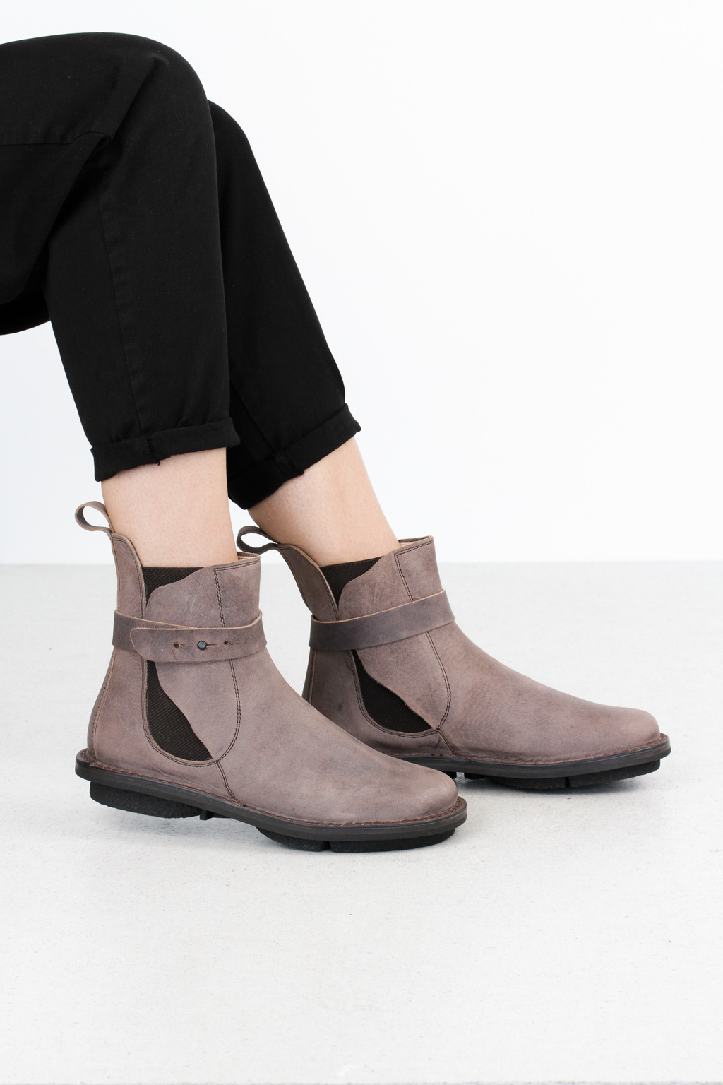 Unisex ankle boot with lateral elastics, inspired by a classic Chelsea boot. The irregular edges partially overlapping the elastics are held in place by an ankle strap with button fastening.