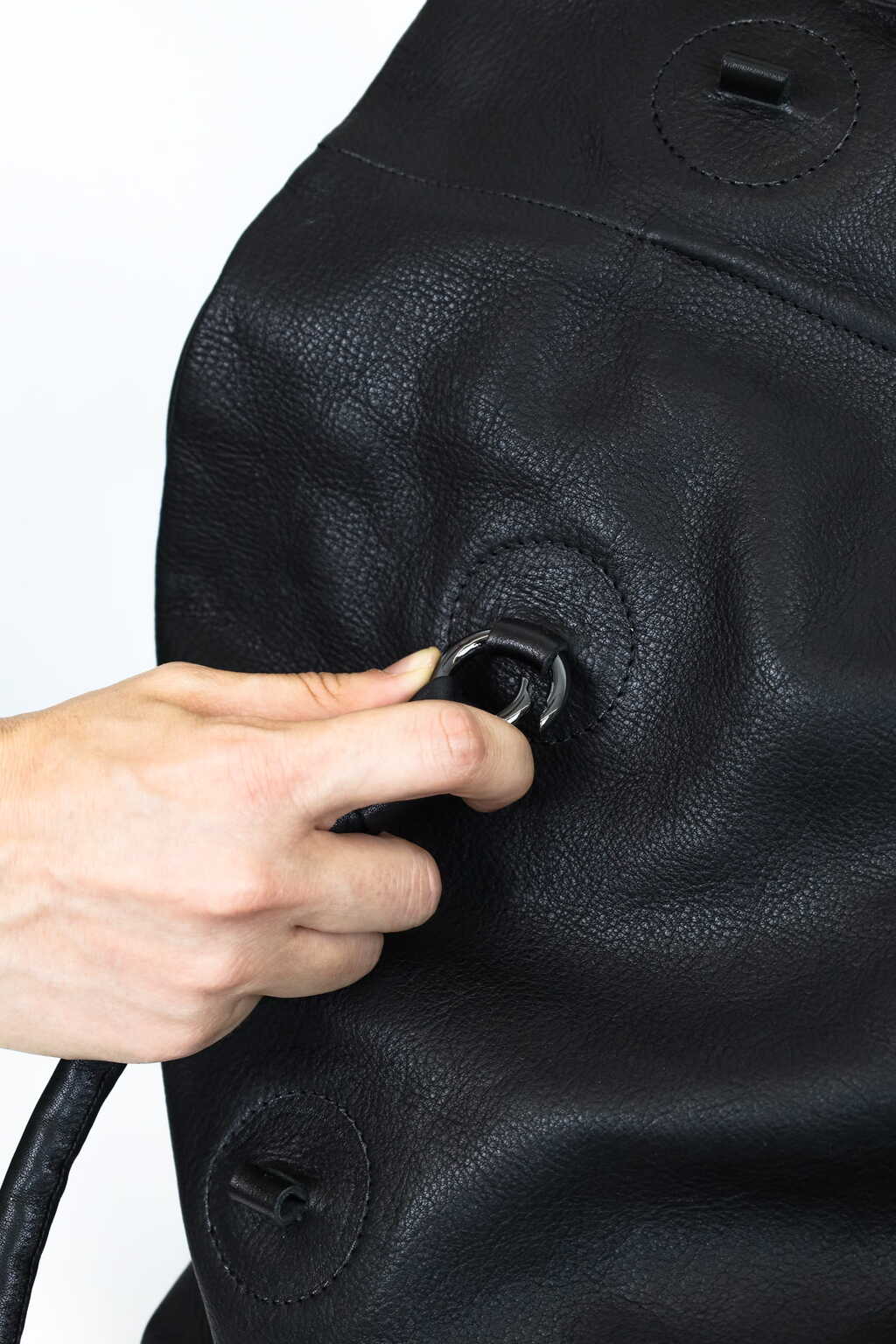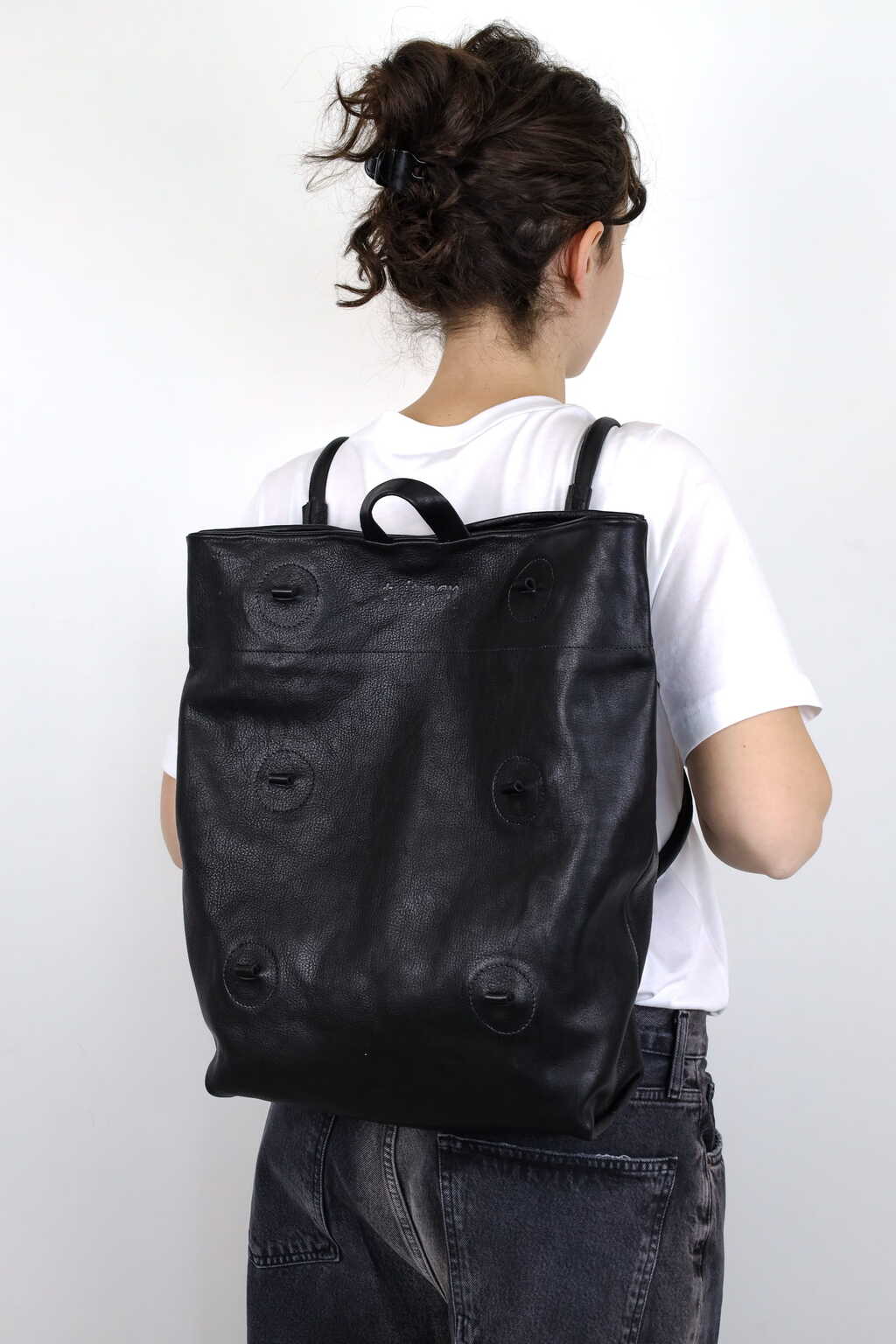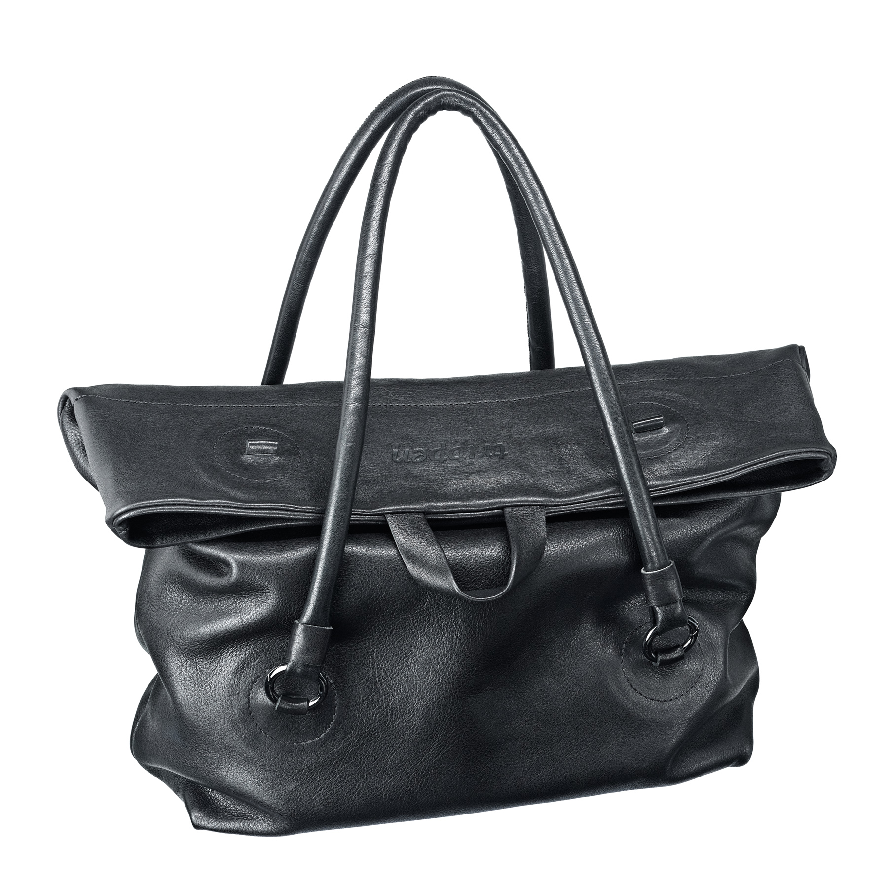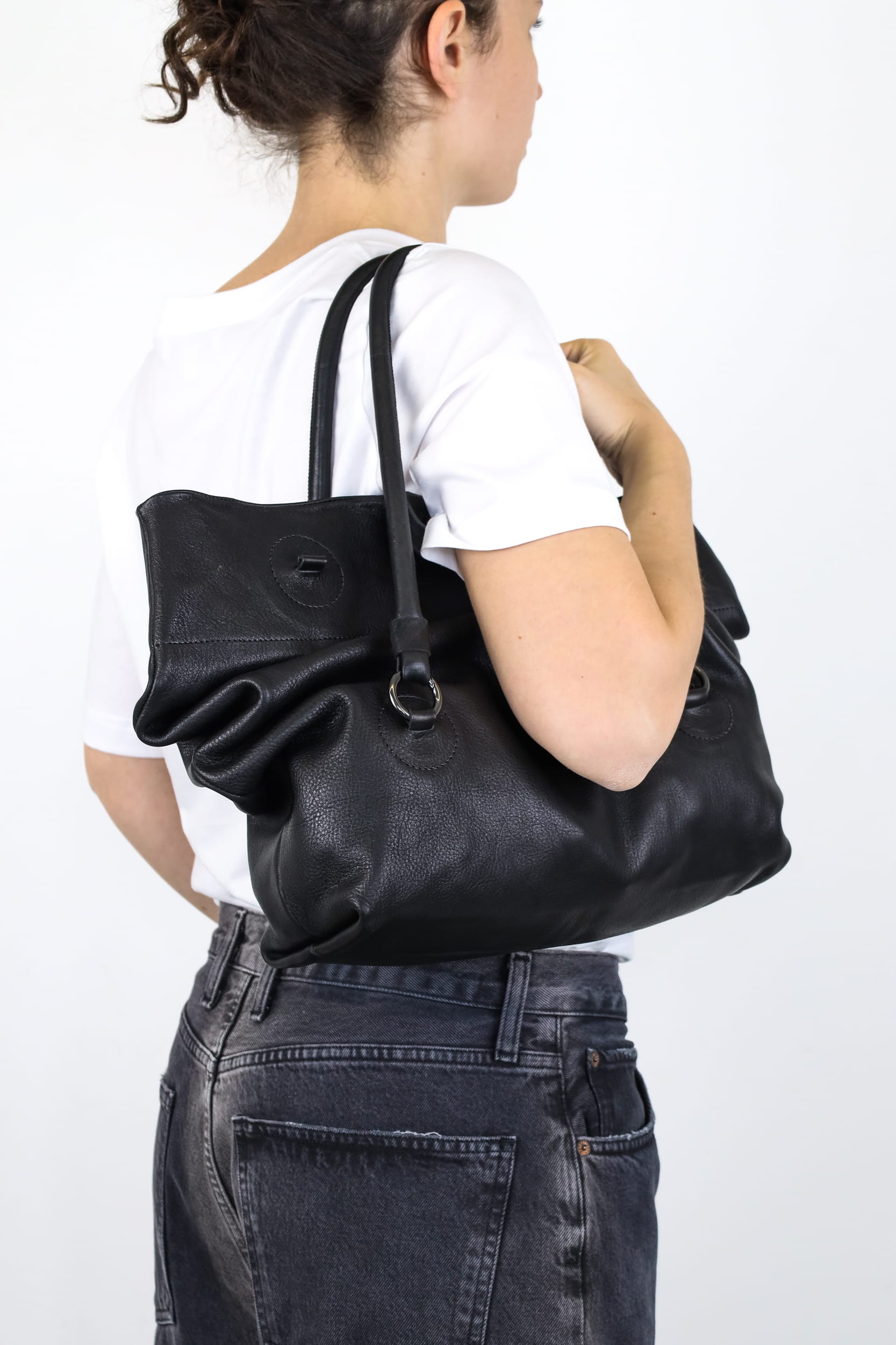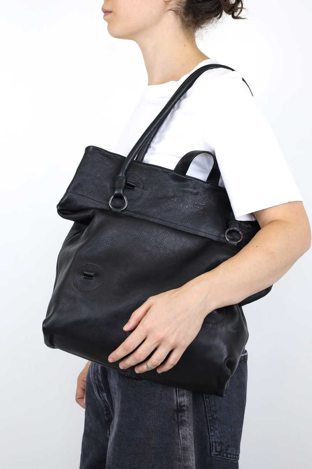 Beweglichen Griffe, die mit Karabinerringen befestigt werden, machen diese geräumige Tasche wandelbar und vielseitig. Drei Griffhöhen bieten drei Taschen in einer: eine dekonstruierte, raffinierte Baguette-Tasche, eine mittelgroße Umhängetasche und eine Laptop-Tasche.
