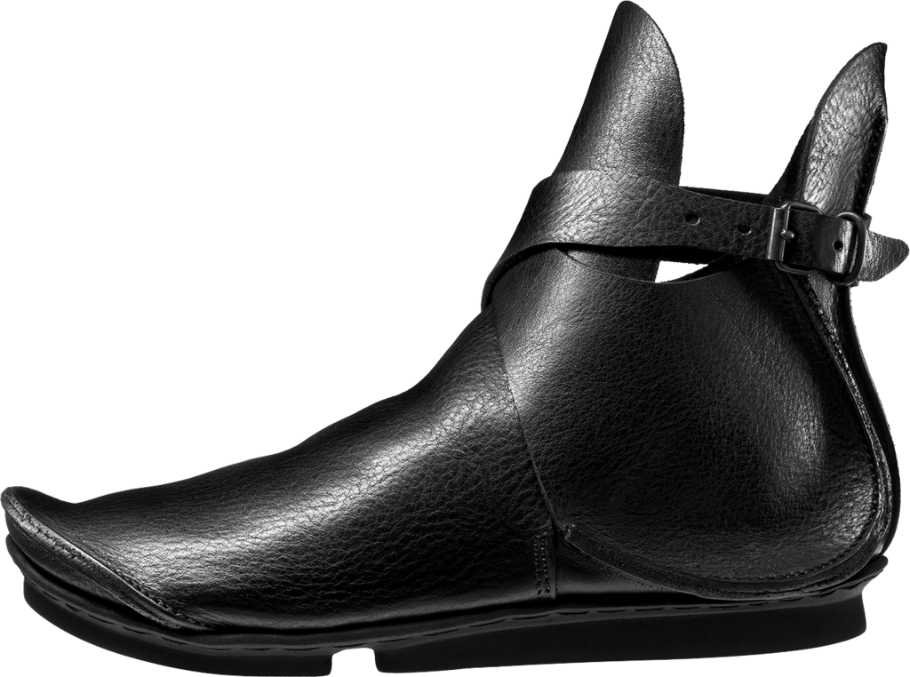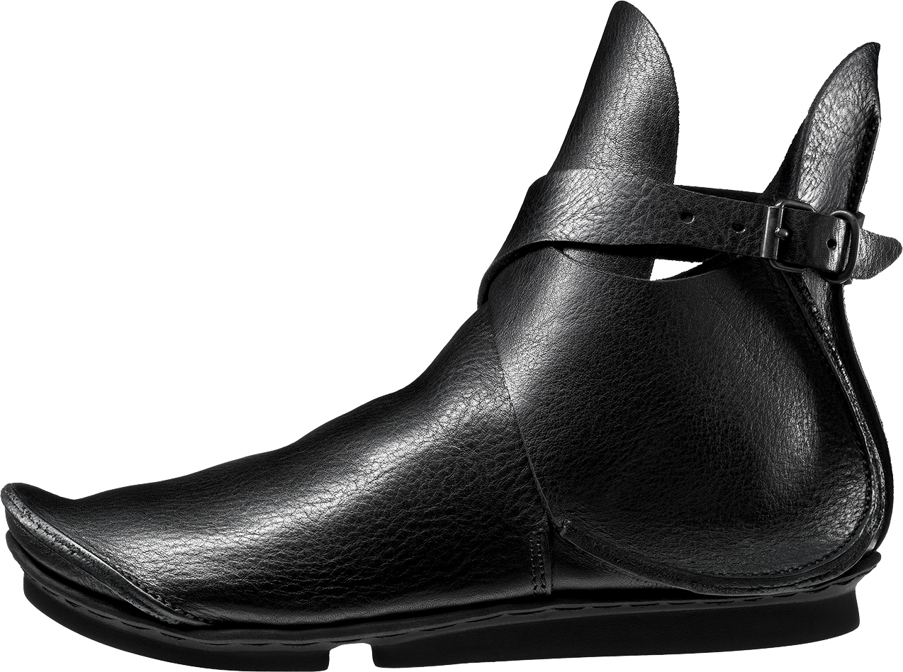 A strap tied criss-cross around the ankle holds vamp and heel section together.