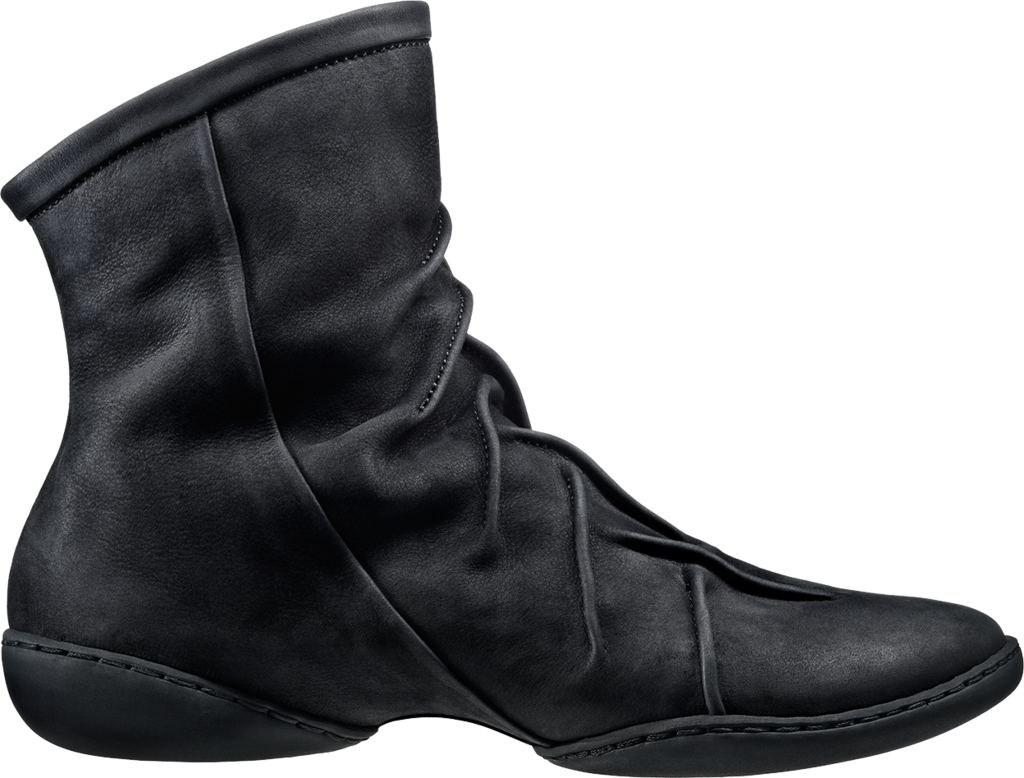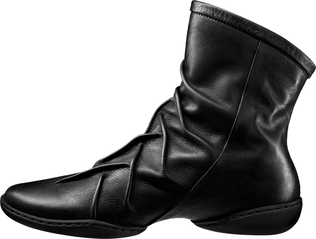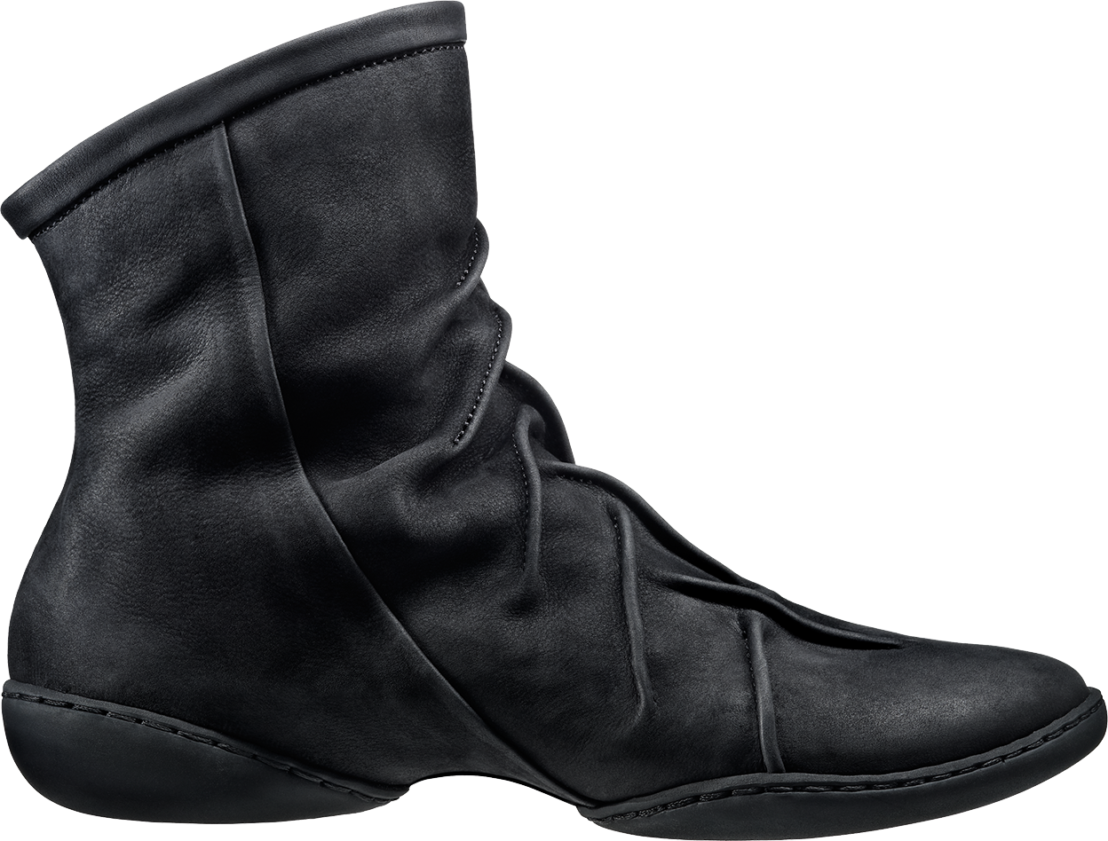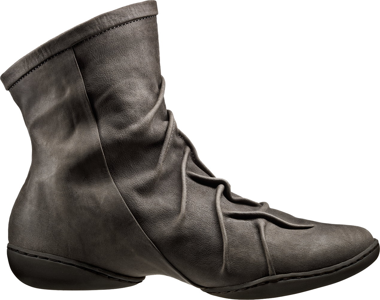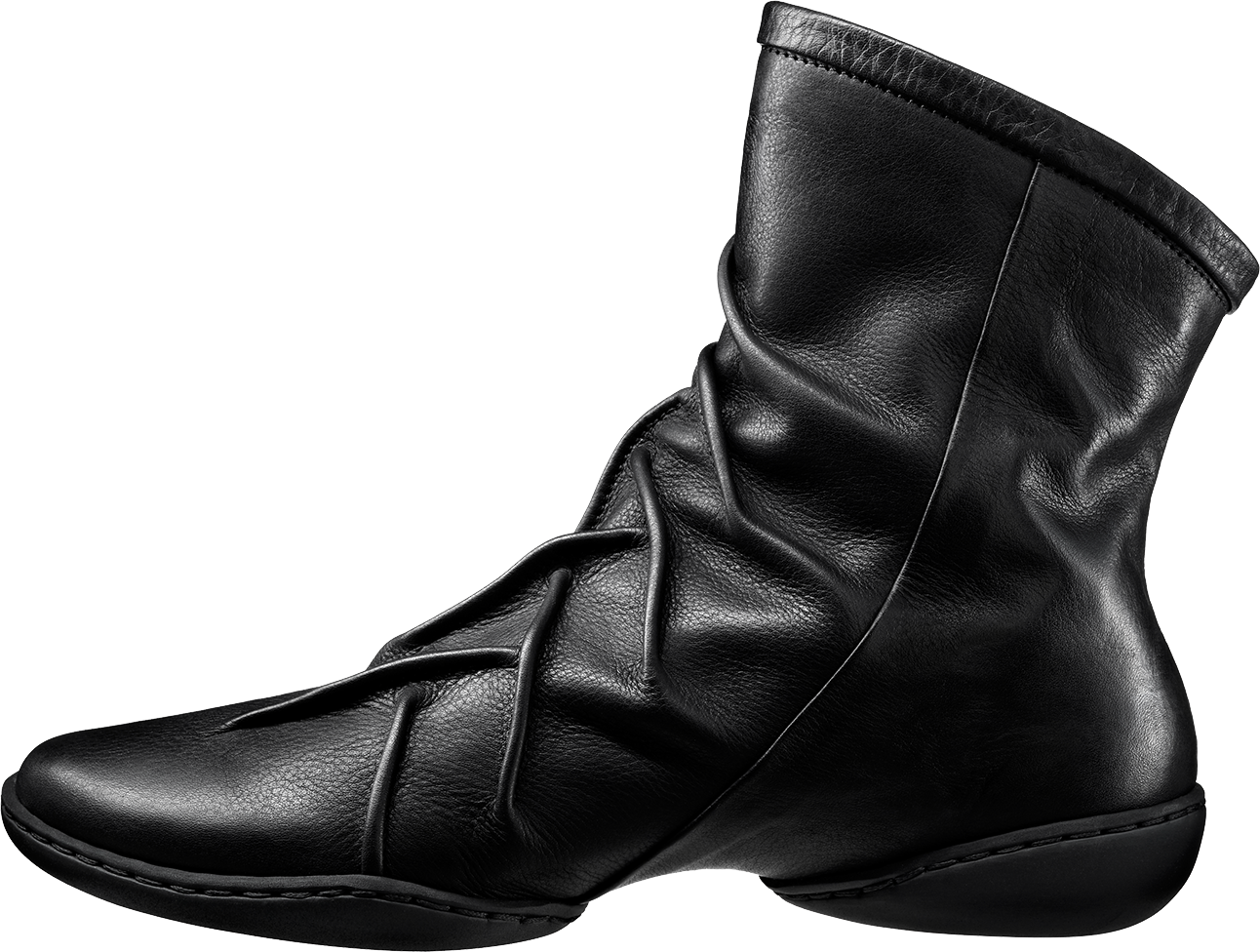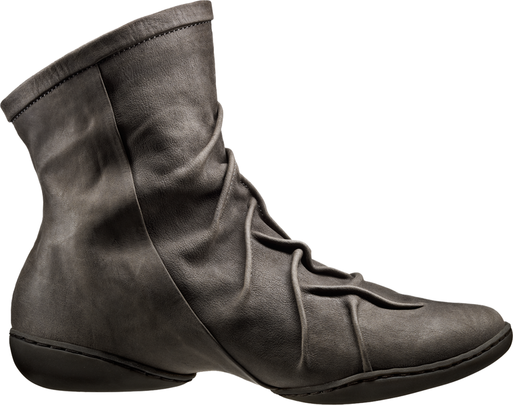 Ankle-high boot with inner zip fastener. The vertically aligned herring bone piping along the back of the foot produces spectacular pleats.