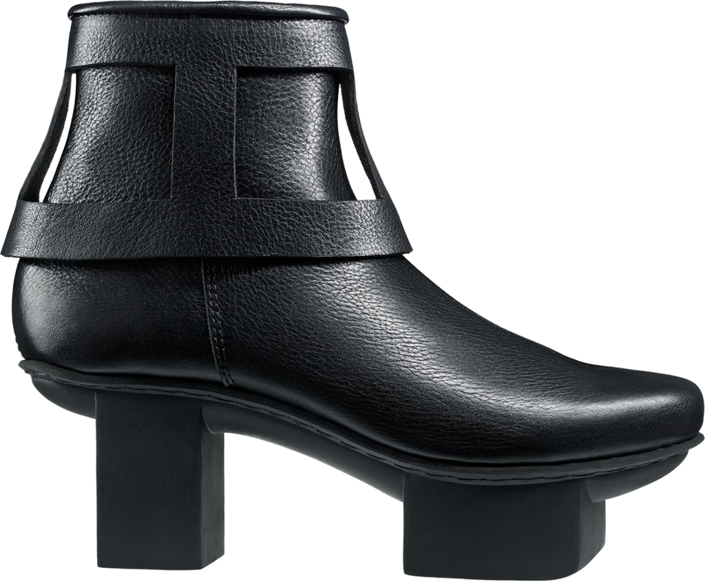 Low-cut ankle boot with inner zip fastener and a wide brim with trapeze-shaped cut-outs.